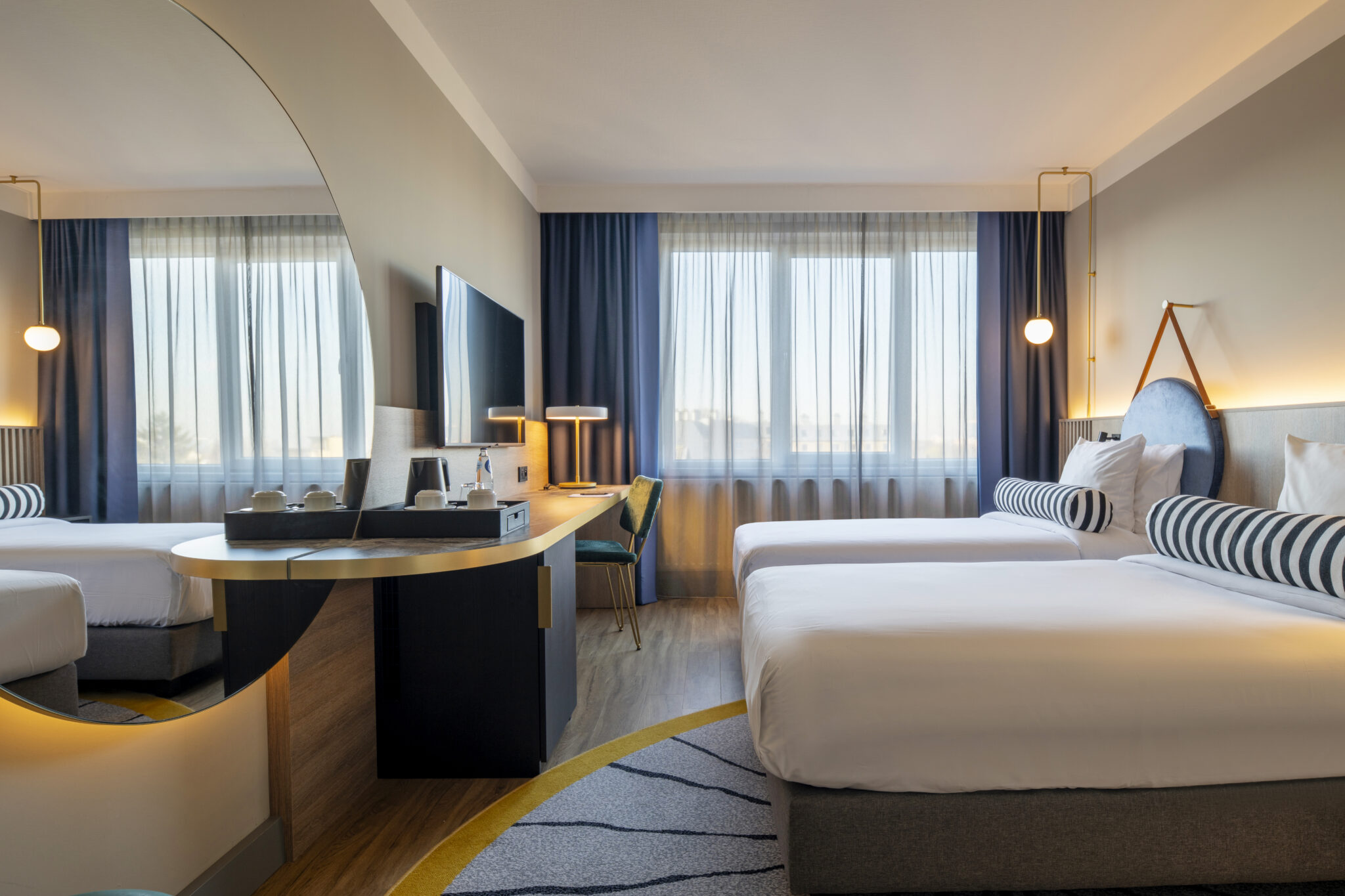 A modern hotel room featuring two neatly made twin beds, a desk with a chair, wall-mounted TV, stylish decor, and a window with curtains.